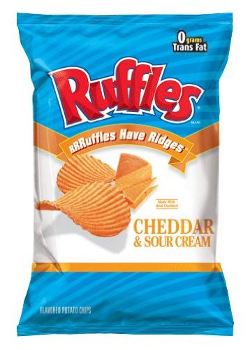 Chip lovers have come to know that R R R Ruffles Have Ridges! The thick ridges of Ruffles Potato Chips help hold more great potato chip flavors and stand up to the thickest dips.Frito Lay Ruffles Cheddar Sour Cream Flavored Potato Chips, 1.875oz Bags (Pack of 24) Feature