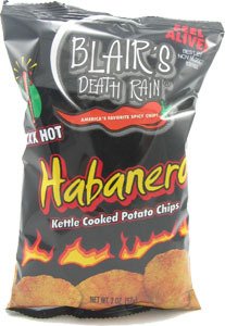 Blair's Habanero Kettle Cooked Potato Chips (2 oz, / 57 g): Blair's Habanero Kettle Cooked Potato Chips 2oz: Welcome to my wonderful world of spice. Since 1989 it has been my passion to create food that makes us smile... to cook up snacks that taste great but most of all make you feel alive. I hope you enjoy this bag as much as I do. Thank you for choosing Death Rain Snacks and my wonderful world of spice... Feel Alive, Blair. Caution: These are not your ordinary, everyday store bought Potato Chips!!! These are covered in Habanero Peppers and spices. These are very HOT!!! But GOOOOD!!!! Go ahead...Buy a few of bags... you'll wish you had,Blair's Habanero Kettle Cooked Potato Chips - 6-Pack (2oz. Bags) Feature